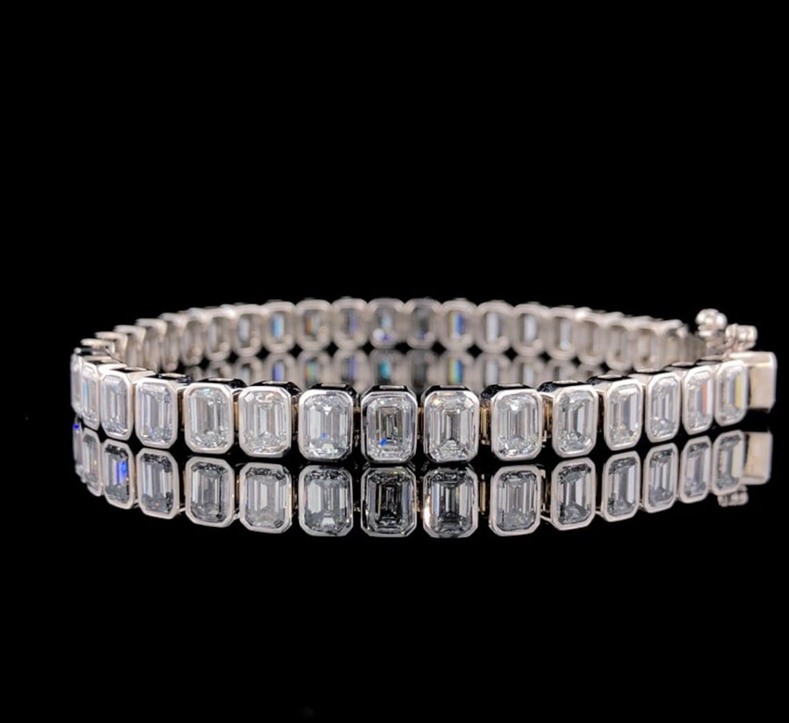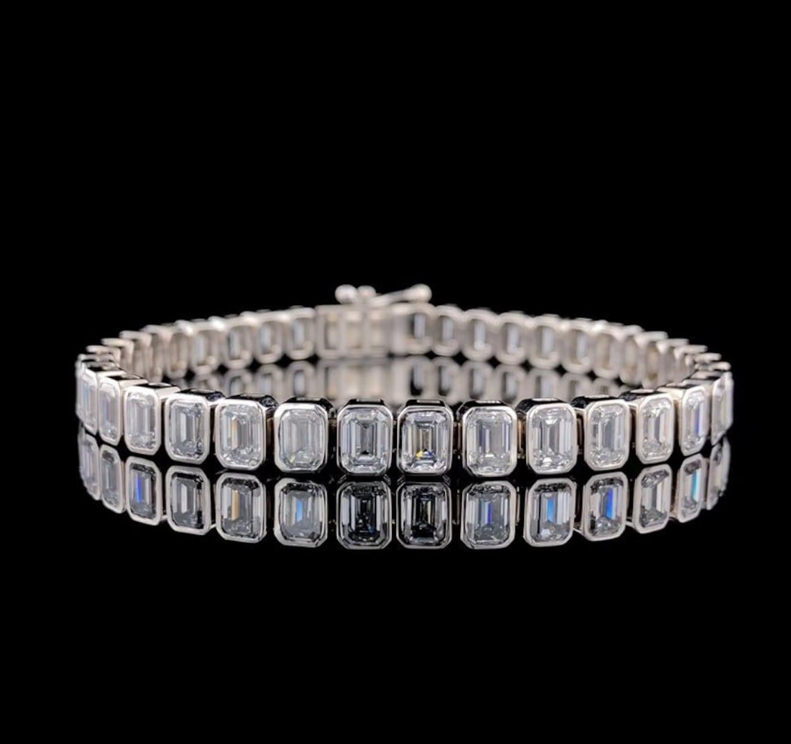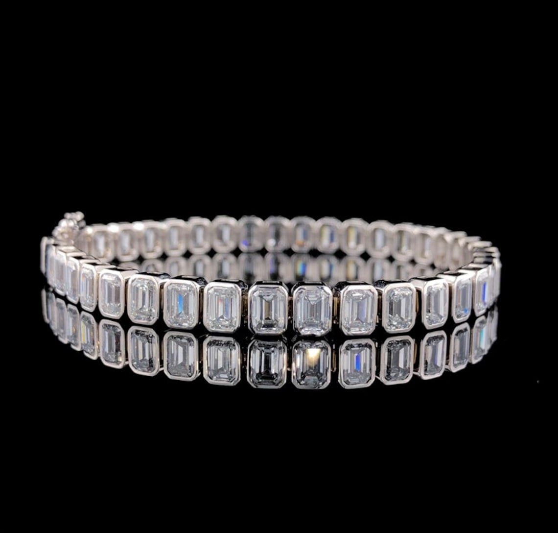 14k White Gold Bezel Set Emerald Moissanite Bracelet – Luxurious Tennis Style Women’s Jewelry, Perfect Anniversary Gift