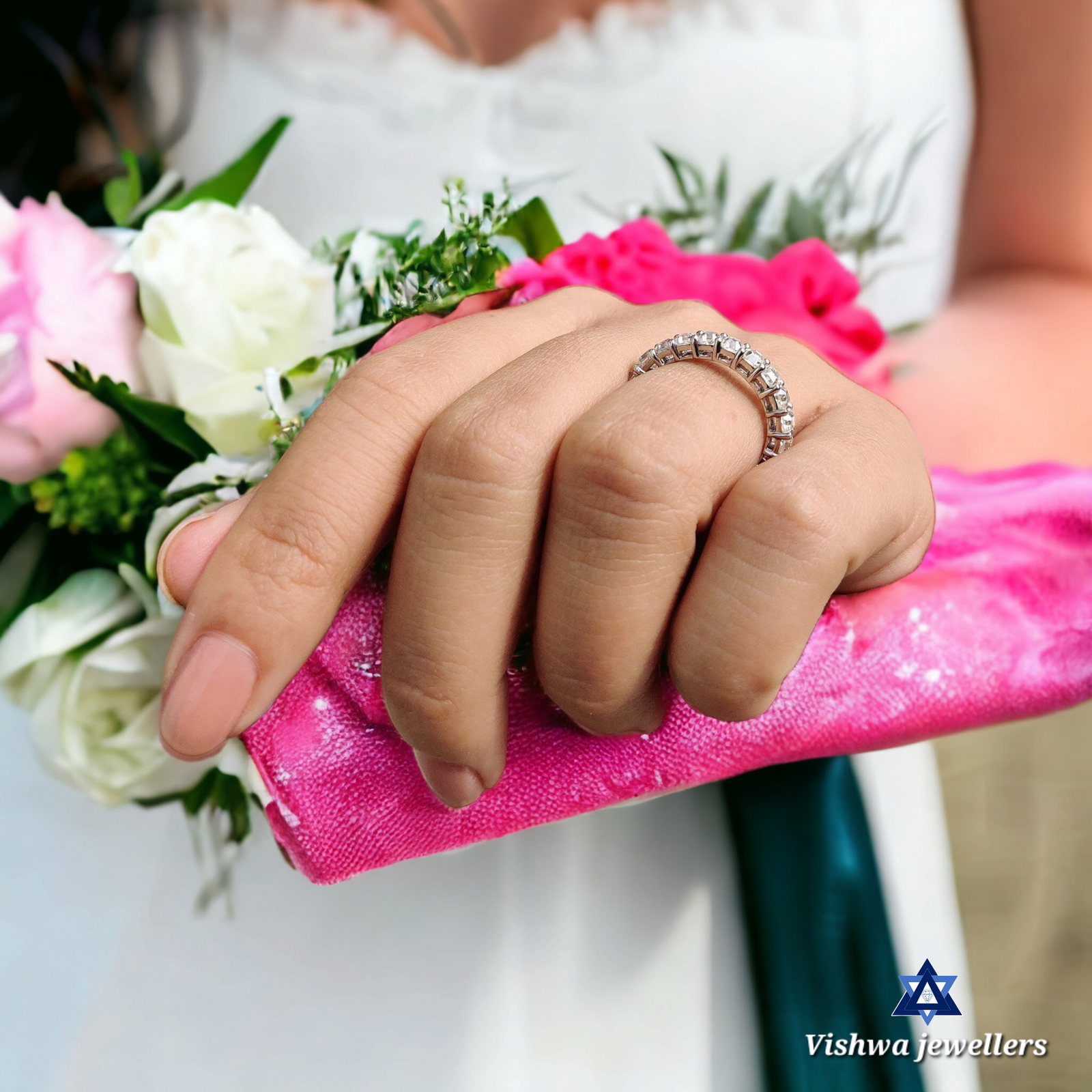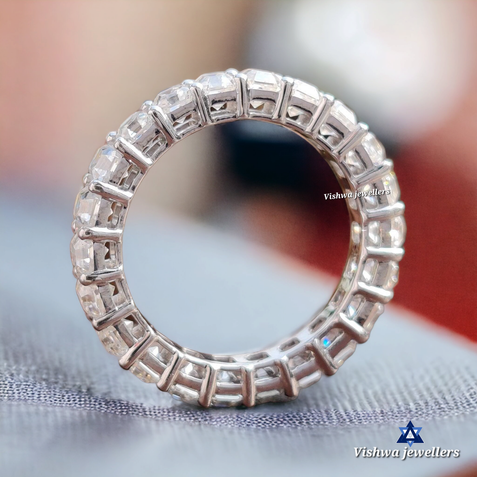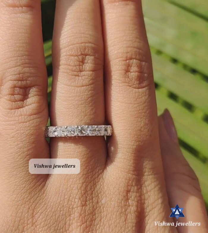 Welcome to Diamond Vishwa, where every sparkle tells a story and every ring holds a promise. Introducing our crowning jewel – the Sparkling Moissanite Diamond Wedding Band, a treasure that embodies eternal love and unwavering commitment. Handcrafted with the utmost care, this full eternity ring features a continuous circle of radiant, round-cut moissanite diamonds, each one meticulously set to catch the light from every angle. It’s not just a ring; it’s a testament to everlasting love.