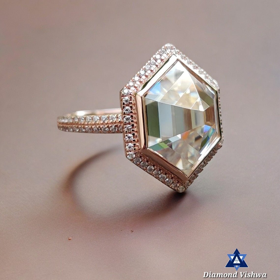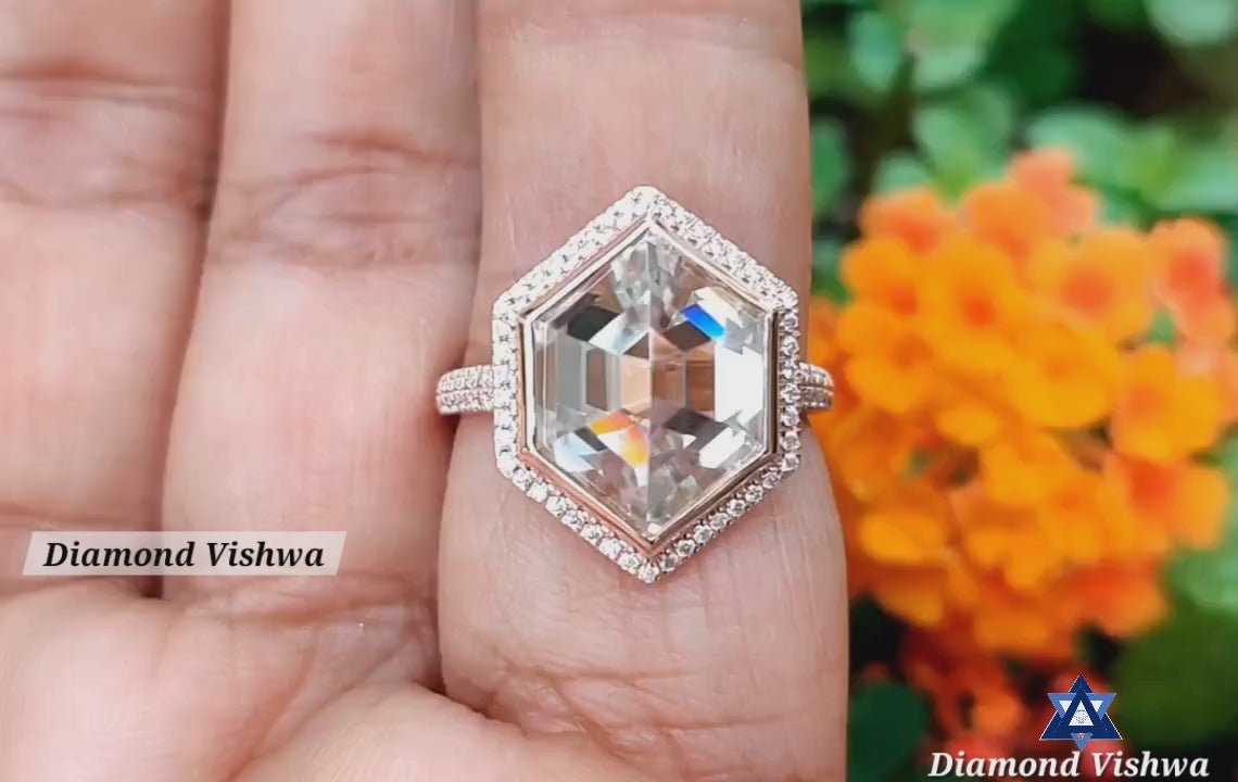 5.33 Carat Hexagon Rose Cut Moissanite Ring – Double Halo Bezel Set Designer Engagement Wedding Ring Vintage Style