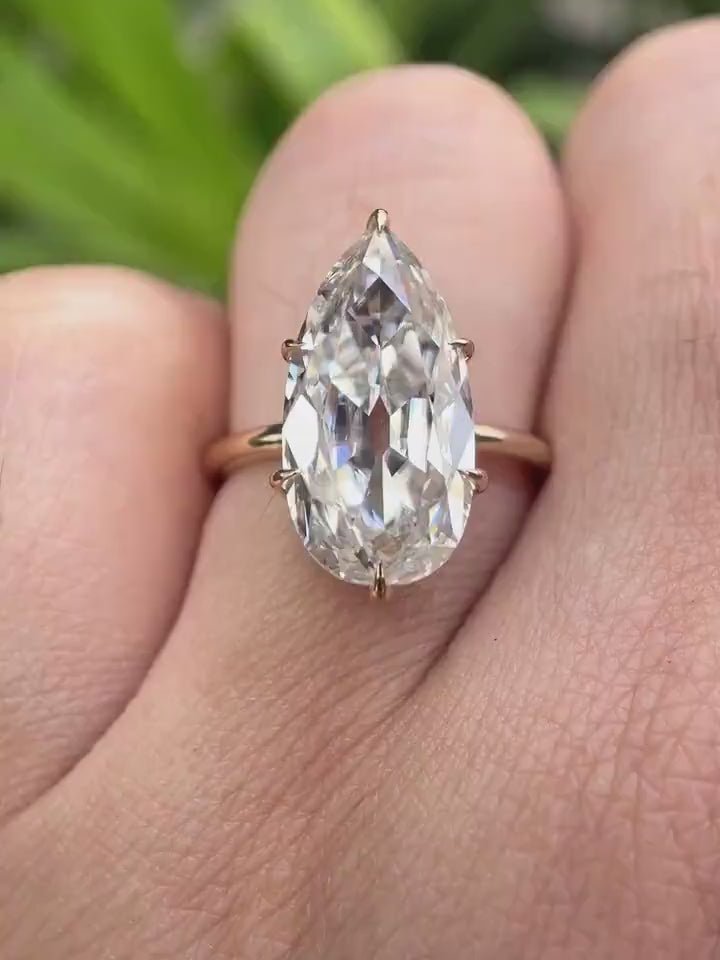 6.1ct Pear Moissanite Engagement Ring – Vintage Old Mine Cut Solitaire | Unique Solid Gold Pear Shaped Statement Ring | Large Classic Gemstone Anniversary Gift for Her