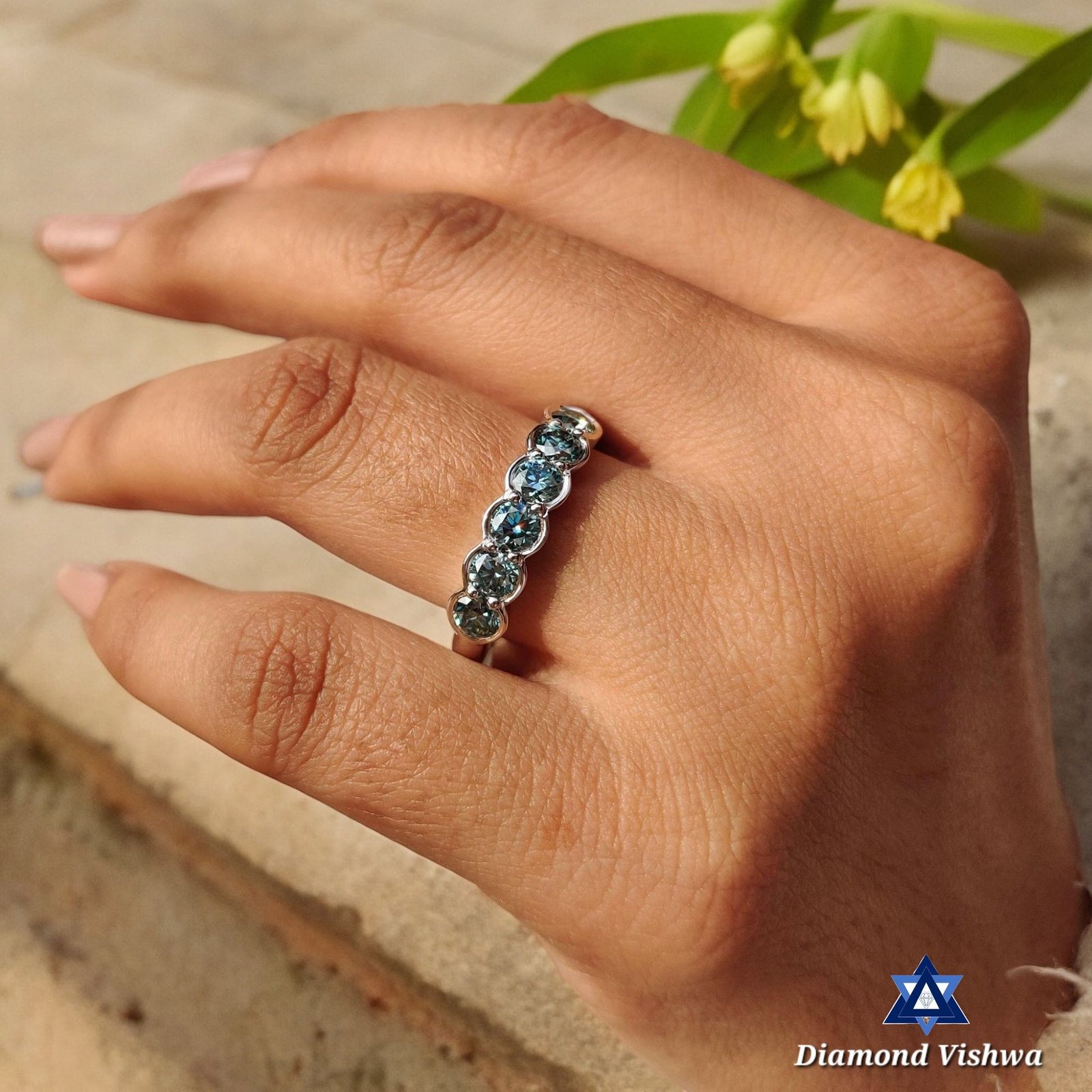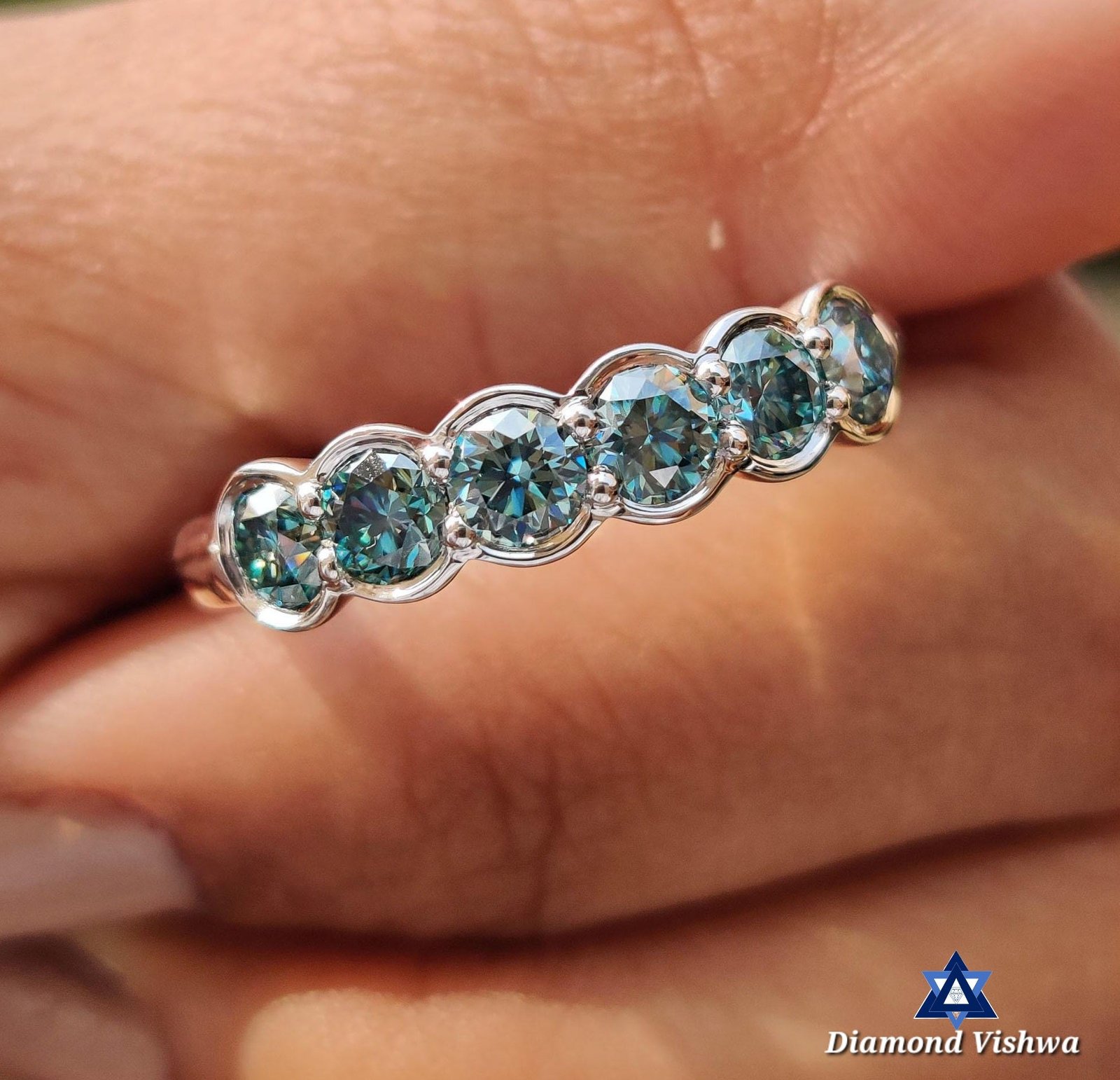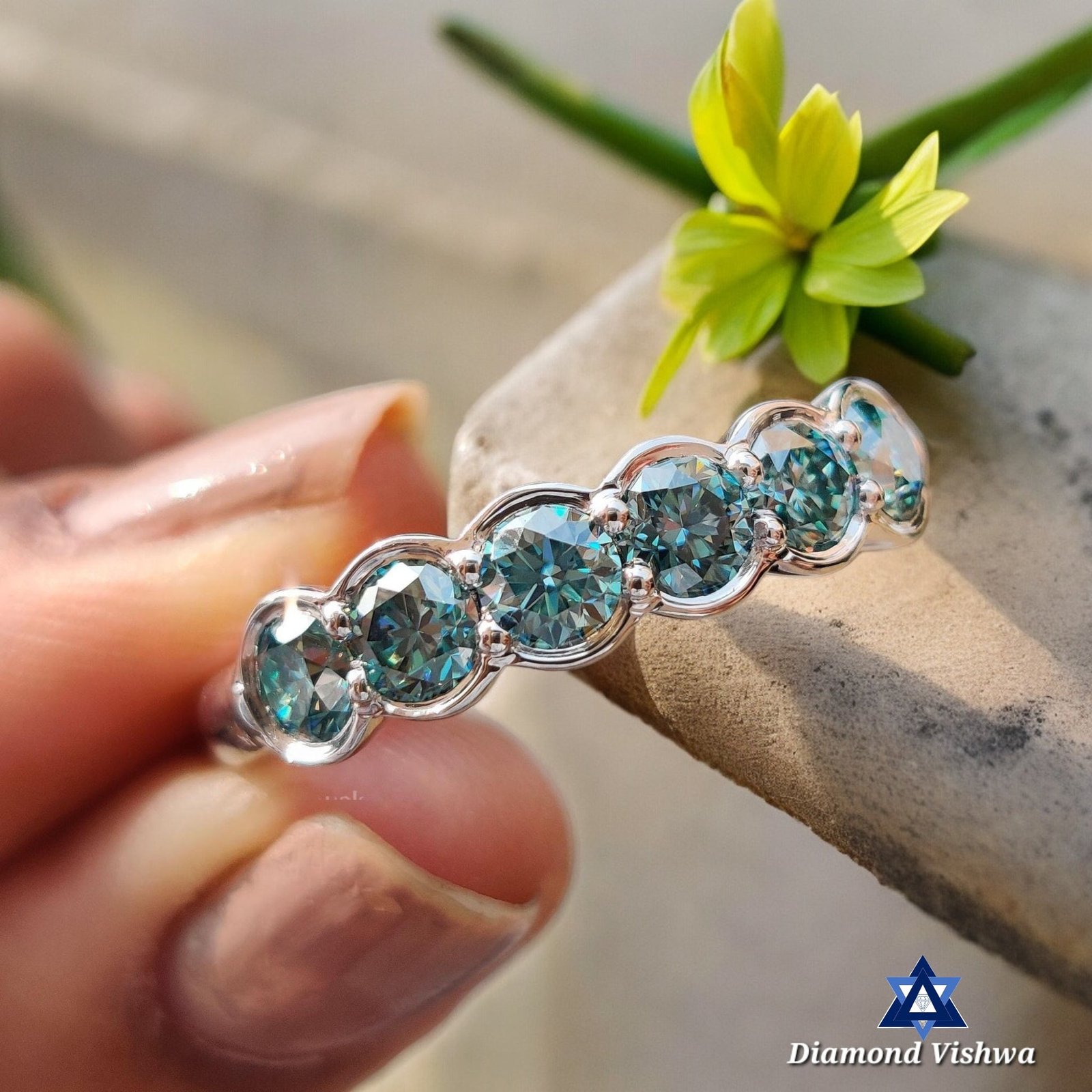 Cyan Blue Round Moissanite 6-Stone Half Bezel Set Wedding Band