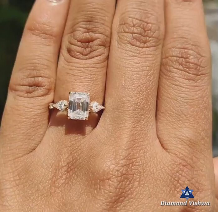 Emerald Cut Three Stone Moissanite Ring – 2.16 CT | Kite Sides