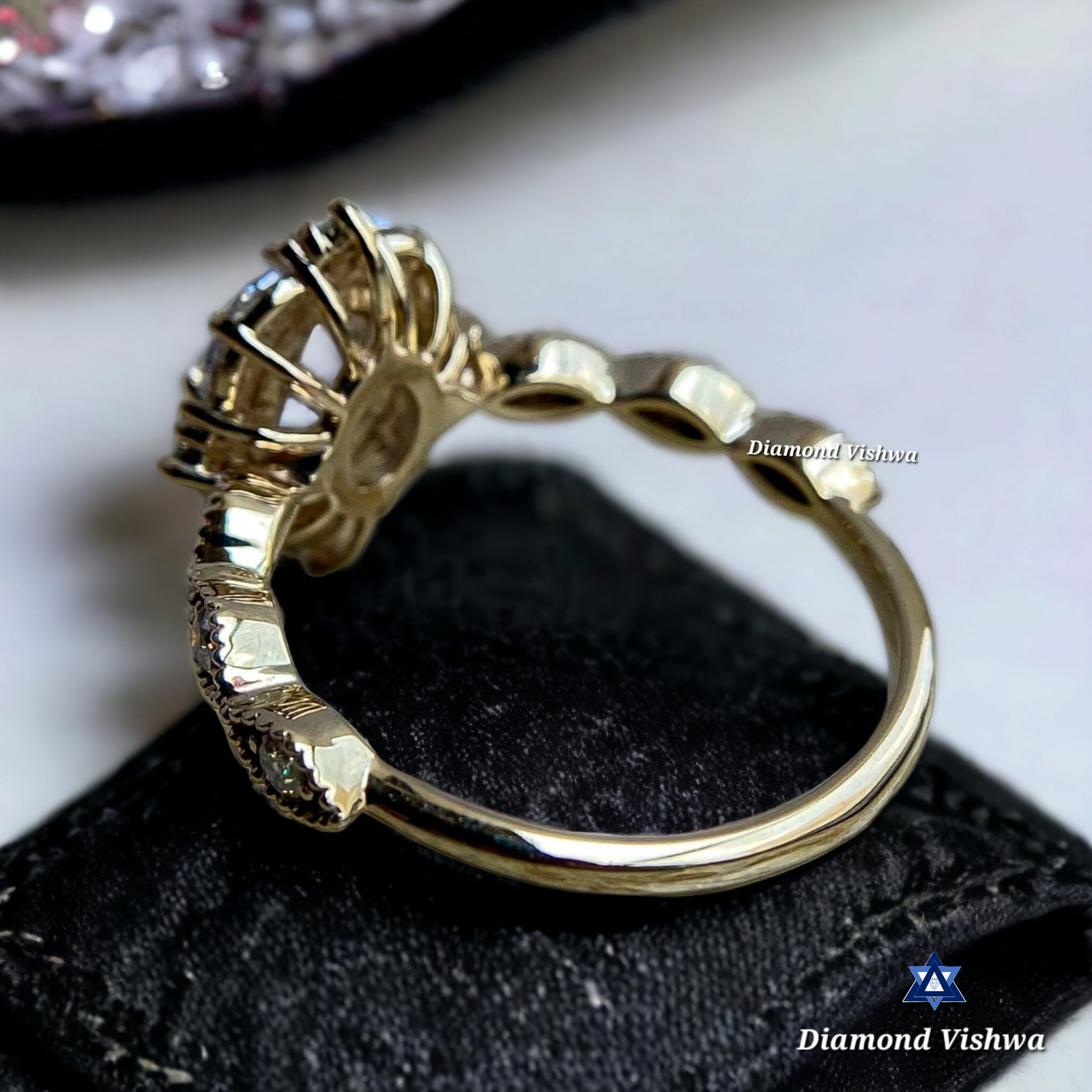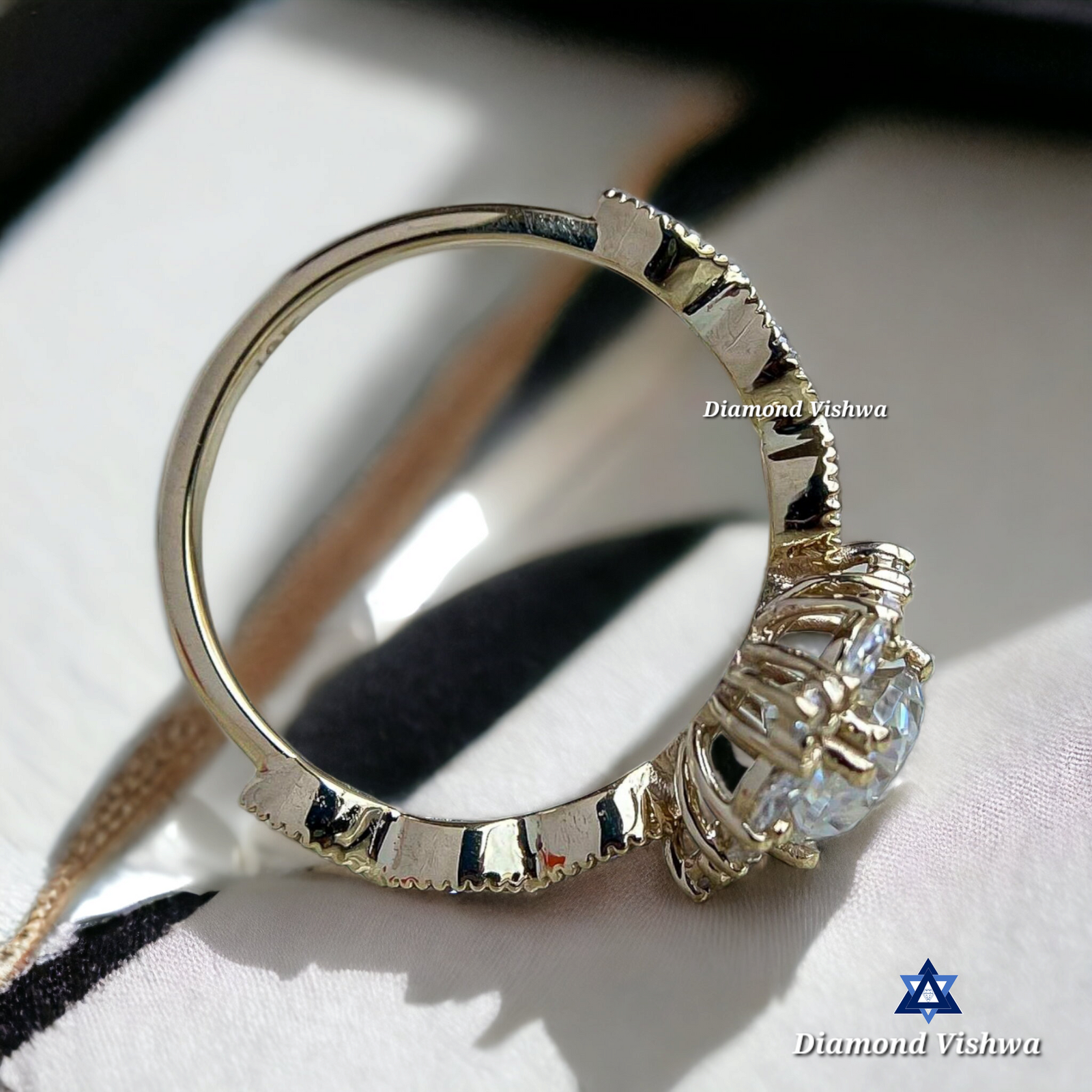 Step into a world of timeless romance with our Luxurious Moissanite Diamond Engagement Ring. Exquisitely handcrafted to symbolize your unique love story, this antique Ring is a masterpiece of design and craftsmanship. Nestled within a majestic setting, the brilliant moissanite diamond radiates a fire and brilliance that rivals the stars. At Diamond Vishwa, we take pride in creating bespoke treasures that celebrate the most memorable moments in your life, offering customization to craft a ring as unique as your b
