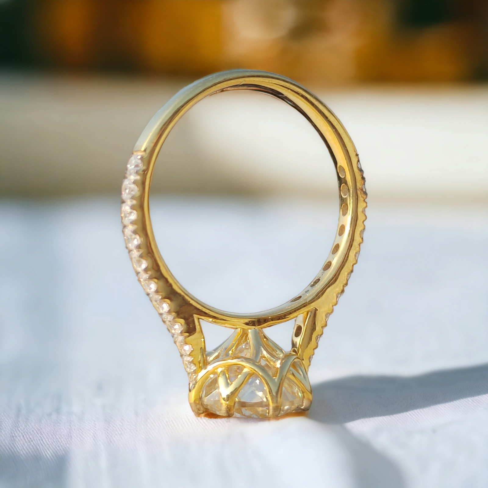 Step into the world of timeless romance with our Luxurious Moissanite Diamond Engagement Ring. Exquisitely handcrafted to symbolize your unique love story, this antique  solitaire is a masterpiece of design and craftsmanship. Nestled within a majestic cathedral setting, the brilliant moissanite diamond radiates a fire and brilliance that rivals the stars. At Diamond Vishwa, we take pride in creating bespoke treasures that celebrate the most memorable moments in your life, and we are delighted to offer customization to craft a ring that’s as unique as your bond.