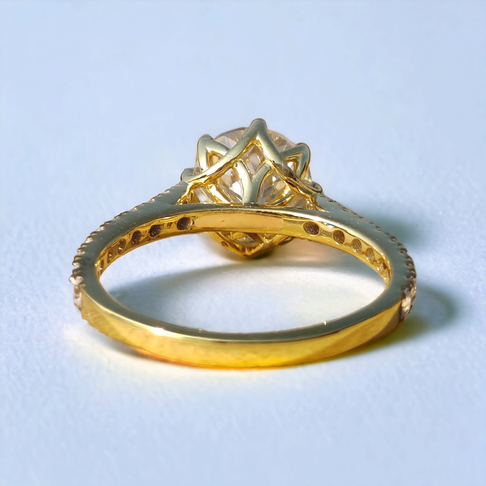 Each moissanite diamond is meticulously selected for its exceptional quality and sustainable brilliance, ensuring your engagement ring is not only a statement of luxury but also an eco-conscious choice. The antique Portuguese cut, known for its intricate faceting, enhances the stone's natural sparkle, making it the centerpiece of adoration. With a band forged from the finest materials, this ring is available in a range of sizes to ensure a perfect fit. To maintain the splendor of your ring, we recommend gentle cleaning with a soft cloth and avoiding exposure to harsh chemicals.
