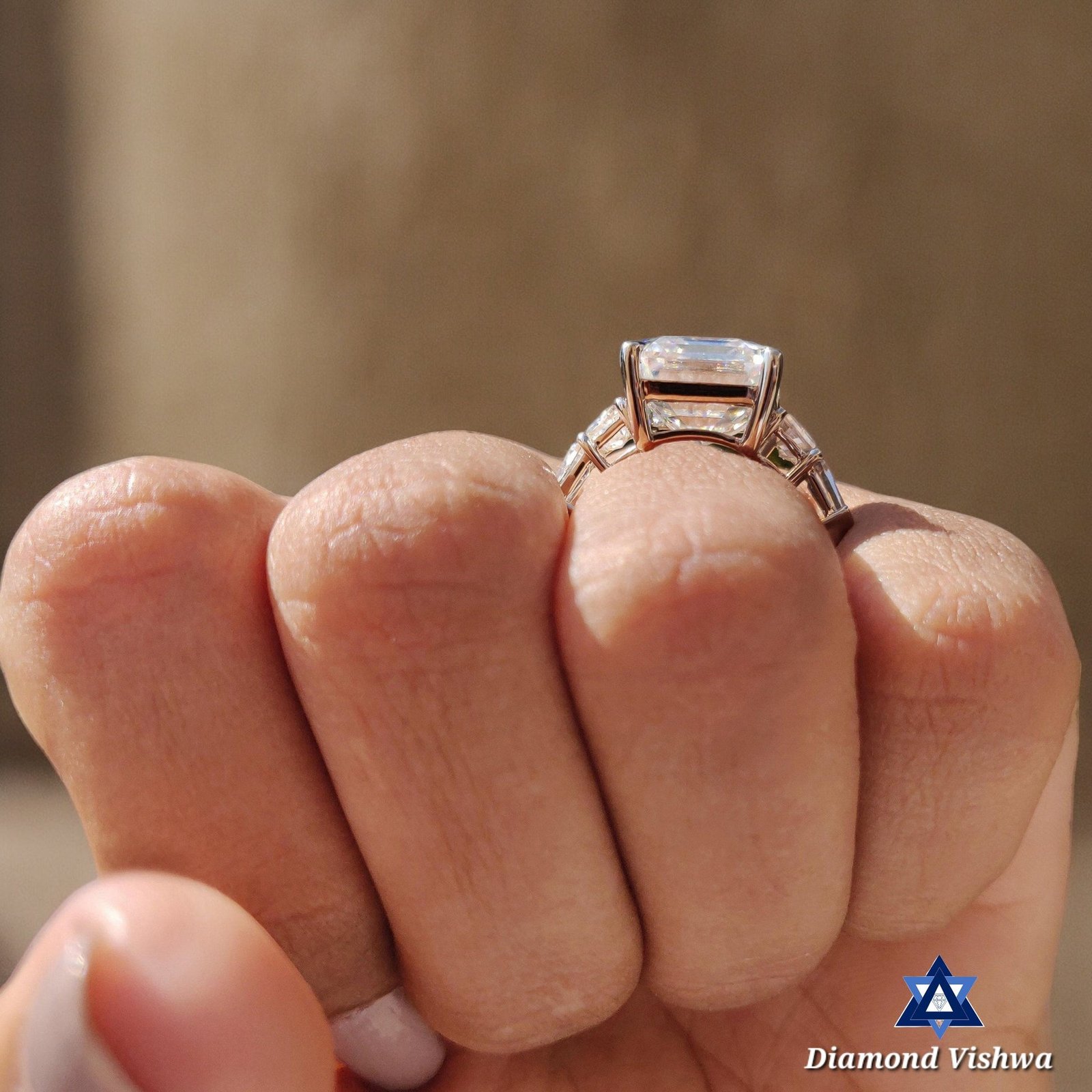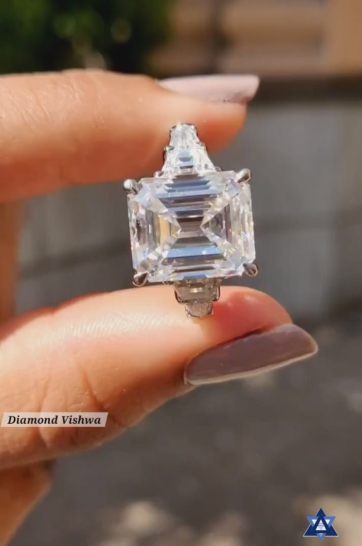 Stunning 10 TCW Vintage Emerald Cut Moissanite Engagement Ring with Trapezoid & Bullet Side Stones – Celebrity Style for Her